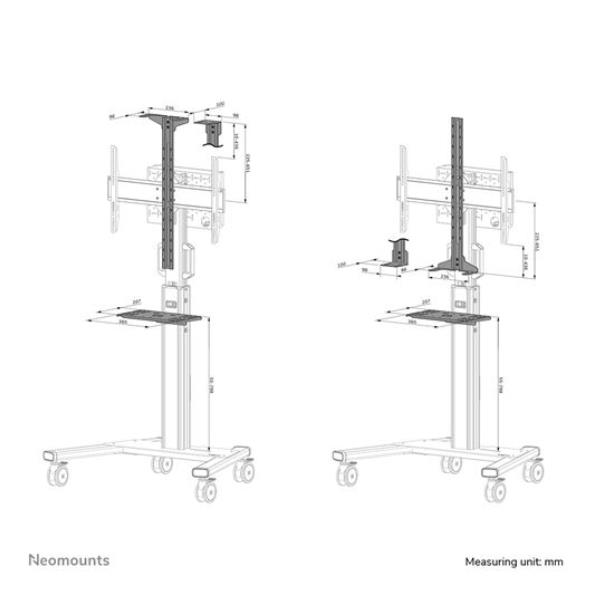 Neomounts AFLS-825BL1 è un kit videobar e multimediale opzionale per la piantana mobile FL50S-825BL1. Il kit consente di installare sul carrello un ripiano separato per cam e dispositivi multimediali. Il ripiano universale per cam può essere installato sia sopra che sotto lo schermo ed è regolabile in altezza, per adattarsi allo schermo. Inoltre, il ripiano per cam può essere montato sia sul fronte che sul retro del supporto. Il kit include un adattatore per la barra Rally e la barra Rally Mini di Logitech (entrambe posizionabili sopra e sotto lo schermo). Inoltre, il ripiano multimediale universale è adatto per l’installazione, ad esempio, del Logitech Tap.