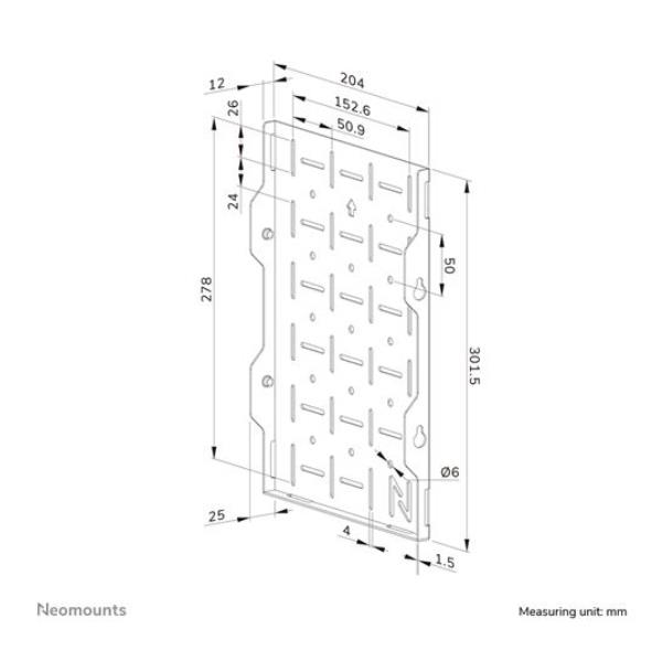 Il rack per hardware AV Neomounts AWL05-750BL è una soluzione pratica per installare un mini-PC, una Apple TV, un NUC o altro hardware AV con un peso massimo di 10 kg sul supporto a parete della serie LEVEL-750. Il rack può essere posizionato a sinistra o a destra del supporto a parete. Il rack è dotato di cuscinetti morbidi sul retro per evitare di danneggiare la parete. Il collegamento dell’AWL05-750BL alla piastra a parete di un supporto a parete della serie LEVEL-750 può essere effettuato rapidamente utilizzando i fori per le chiavi in dotazione.