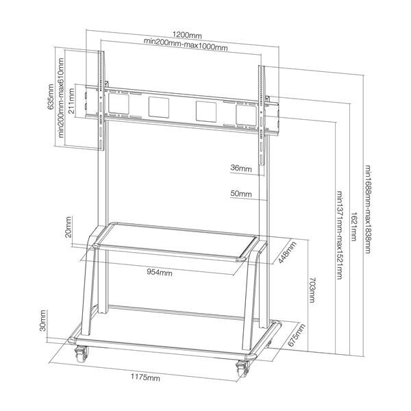 Grazie all’altezza regolabile da 131 a 153 cm, puoi adattare lo schermo alla visuale perfetta per qualsiasi pubblico o ambiente. Il telaio robusto è progettato per un carico massimo di 150 kg, garantendo stabilità e sicurezza anche per i monitor più grandi e pesanti.