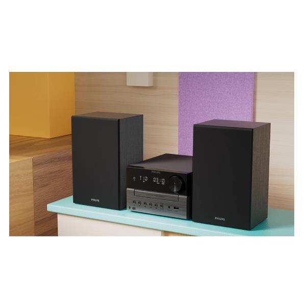 Scopri un audio stereo eccezionalmente nitido con bassi profondi, grazie agli altoparlanti da scaffale che sfruttano al massimo la potenza in uscita da 20 W (RMS) del sistema, i woofer da 3" e le porte Bass Reflex. Il controllo audio digitale ti consente di scegliere tra stili di audio predefiniti: dalla musica ai programmi radiofonici, otterrai sempre il migliore audio possibile per ciò che ascolti.