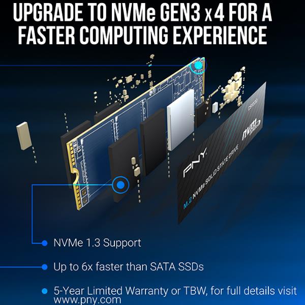L’SSD PNY CS1030 M.2 NVMe è una scelta eccellente per un aggiornamento NVMe da un’unità a stato solido (SSD) basata su SATA o da un disco rigido tradizionale in un computer desktop o laptop abilitato per NVMe. L’unità CS1030 è progettata per essere un aggiornamento dall’archiviazione basata su SATA convenzionale per sfruttare l’elevata larghezza di banda dell’interfaccia NVMe per contribuire a ottenere tempi di avvio più rapidi, avvii delle applicazioni più rapidi e migliori prestazioni complessive del sistema. Fai di più in meno tempo con NVMe; avvio, spegnimento e caricamento delle applicazioni fino a 4 volte più veloci rispetto agli SSD basati su SATA. Senza parti mobili, l’SSD PNY CS1030 M.2 NVMe è estremamente resistente, ha meno probabilità di guasti e supporta una garanzia limitata di 5 anni o TBW*.