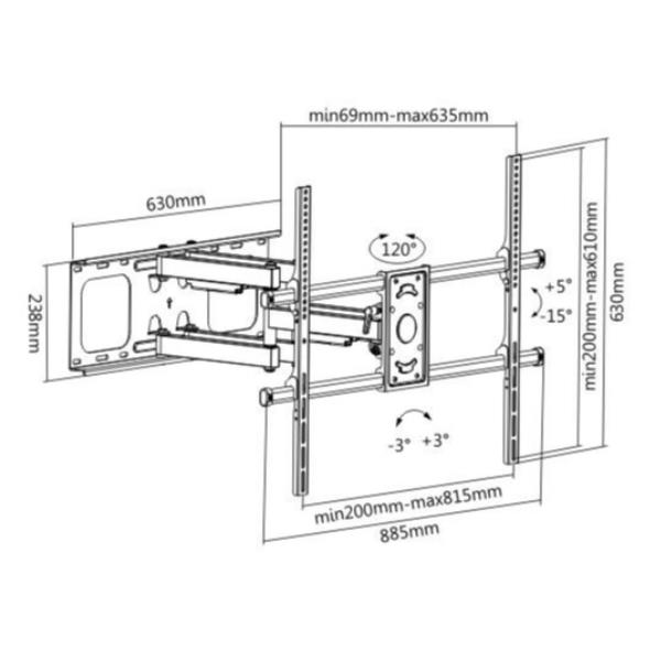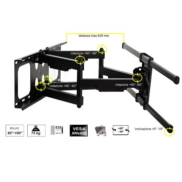 Robustissimo supporto per monitor o TV, che permette una gamma di movimenti molto estesa. Si adatta a video 50"-100" LED, LCD sia curvi sia piatti. Costruito in acciaio molto robusto, può sostenere anche TV molto pesanti fino a 75 kg di peso. Questo supporto permette di regolare la TV in tutte le sue direzioni, per evitare il riflesso o per posizionarlo all’angolo di visione ottimale. Si può estendere da 69 fino 635 mm dal muro. Con sistema di aggancio rapido del monitor che ne semplifica l’installazione, senza necessità di attrezzi. Ha un sistema integrato di gestione cavi con coperchi che rendono l’insieme ordinato. Lo schermo è orientabile a seconda delle esigenze: Inclinazione: 5°-15° Rotazione laterale: +60°-60° Livellamento: +3° -3° Spessore delle parti in acciaio: pannello 3 mm, braccio 2 mm Dimensione dei supporti: 40x25x1,5 mm Ricopertura: Verniciatura a polvere Dimensioni: 635x885x630 mm Standard VESA: 200×200, 300×200, 300×300, 400×200, 400×300, 400×400, 600×400, 800×400, 800×600 Max VESA: 816×610 mm
