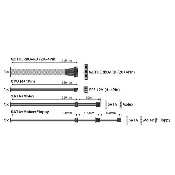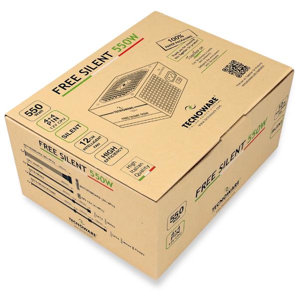 Alimentatore interno per personal computer, potenza 550 w, tensione d’ingresso 230 Vac, 50/60 Hz, conforme alle specifiche atx 12V v.2.01, interruttore principale, protezione da sovratensioni, protezione da sovracarico, protezione da corto circuito, elevato MTBF, alta affidabilità, silenziosità di funzionamento, ventola silent da 12 cm, controllo in temperatura della velocità della ventola, lunghezza cablaggi 35 cm, 1 connettore 20+4 poli, 1 connettore 12V 4+4 poli, 2 connettori molex, 1 connettore floppy, 2 connettore Sata, dimensioni 150x140x85 mm, peso 1,0 Kg, certificazione CE, Rohs, confezione singola.