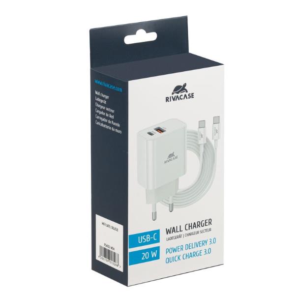 RIVACASE PS4192 Power Delivery 20W wall chargerProduct Features:• Type-C & USB wall charger• Power Delivery 20W• Quick Charge 2.0/3.0• Support Huawei FCP, Samsung AFC• FAST charger for iPhone (iPhone 8 and newer)• Outer shell is made of non-flammable and durable plasticSpecifications:• Input: 110 – 240 V, 50-60 Hz.• Output:USB-C 5V 3A, 9V 2.22A, 12V 1.67AUSB-A 5V 3A, 9V 2A, 12V 1.5ASimoultaneously USB-C + USB-A 5V 3A MAXDimensions: 80 ? 42 ? 28 mm.Colour: white.USB-C to USB-C 1 m cable (up to 3A) included