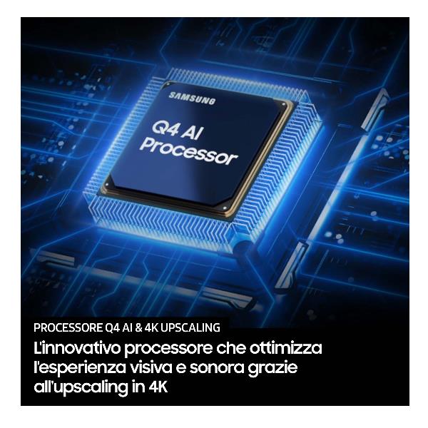 Il televisore Samsung serie Q7F non si limita a mostrare immagini: le crea con una fedeltà straordinaria. Al suo cuore batte il processore Q4 AI, che analizza e ottimizza ogni fotogramma in tempo reale per regalarti una nitidezza 4K impeccabile, sia che tu stia guardando un film d’azione che un documentario naturalistico.