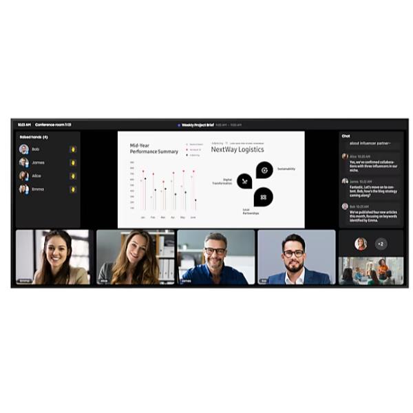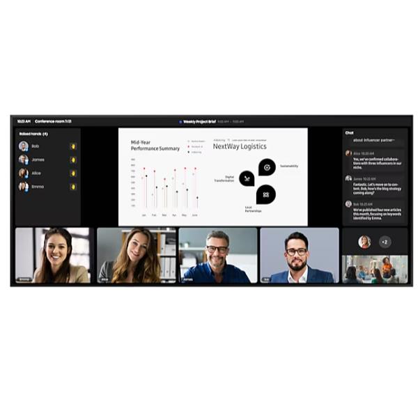 Dimentica i fastidiosi bordi neri tra uno schermo e l’altro. Con il formato ultra-wide 21:9, ottimizzato per le videoconferenze, ogni partecipante – in sala o in remoto – ha la stessa visibilità perfetta su presentazioni, dati e volti.