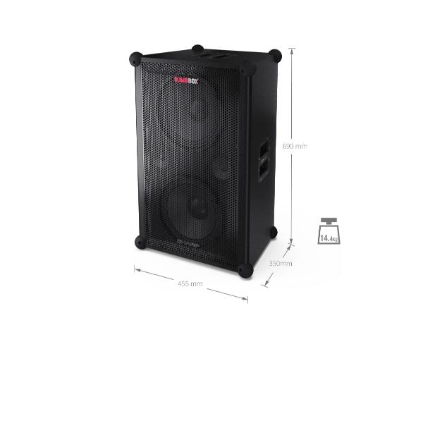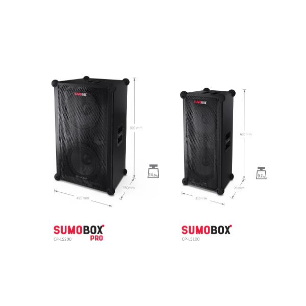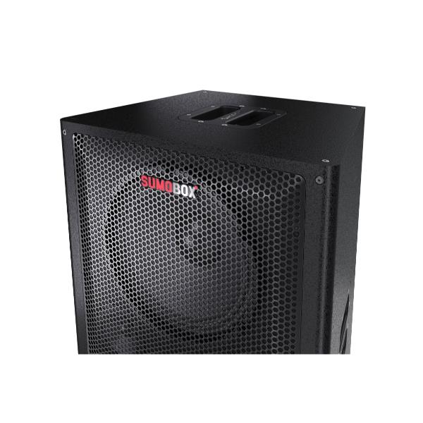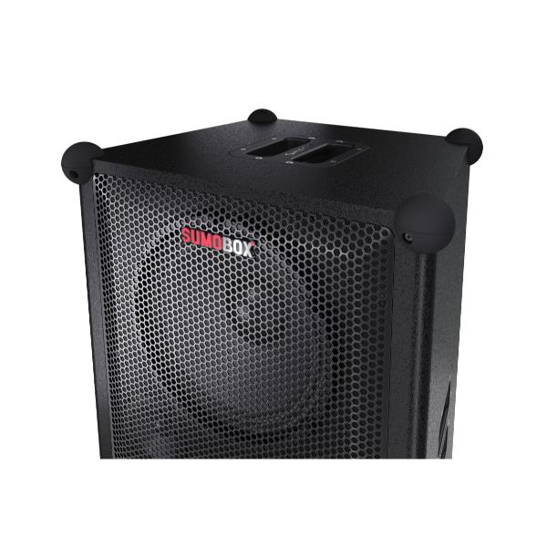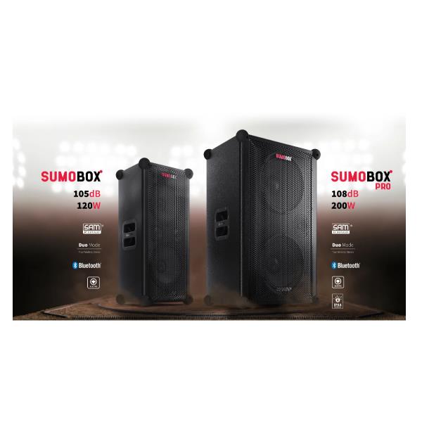SumoBox Pro è un altoparlante portatile versatile, resistente agli schizzi (classificato IPX4), alimentato da un pacco batteria al litio-ionico rimovibile/ricaricabile e può erogare fino a 108 dB di pura potenza sonora.