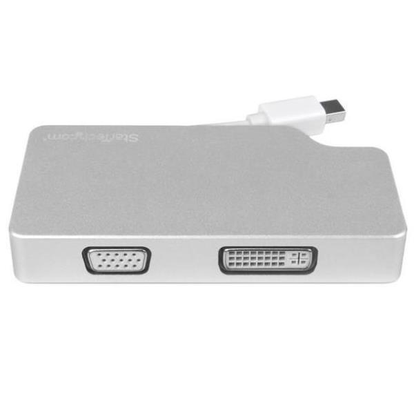 Adattatore da viaggio 3 in 1 portatile per il collegamento di un computer dotato di Mini DisplayPort® a un display VGA, DVI o HDMI®.