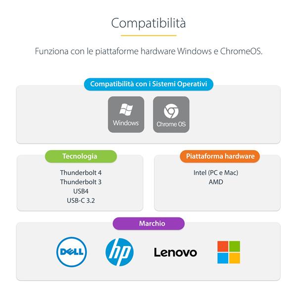 Compatibile con la maggior parte dei laptop USB-C, USB4 e Thunderbolt su Windows e ChromeOS, è la soluzione plug-and-play definitiva per chi lavora da remoto, in ufficio o in viaggio.