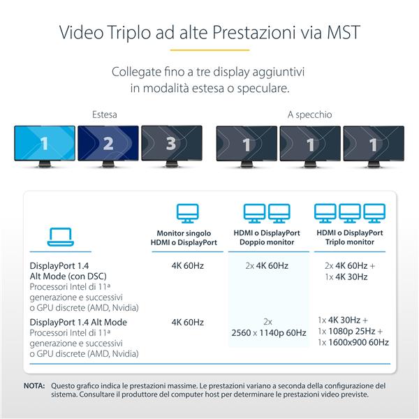 Collega fino a tre monitor senza sforzo. Grazie alle uscite DisplayPort 1.4 e HDMI 2.0b, puoi configurare un setup triplo schermo, perfetto per aumentare la produttività. Ottieni due display a 4K a 60Hz fluidi e un terzo a 4K a 30Hz, sfruttando direttamente la potenza grafica del tuo laptop per un video di qualità e un carico minimo sulla CPU.