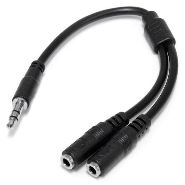 Il cavo splitter/Y stereo slim 3,5 mm MUY1MFFS presenta un connettore maschio 3,5 mm e due connettori audio femmina 3,5 mm per suddividere un singolo jack per auricolare in due.