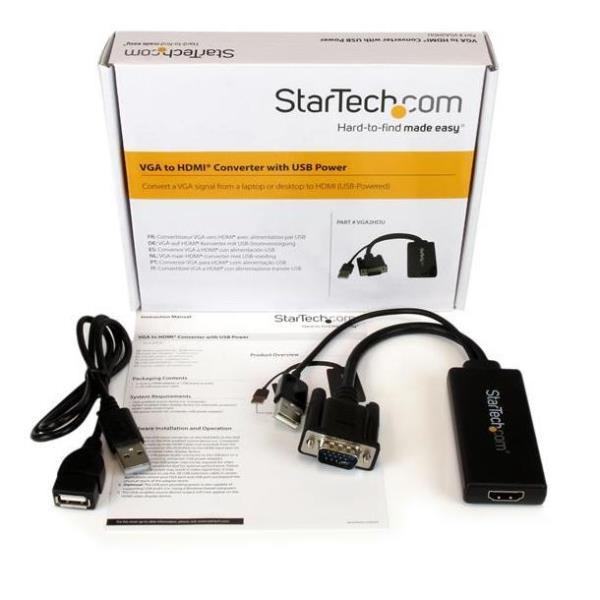 Per una configurazione senza problemi, l’adattatore VGA a HDMI permette l’installazione plug-and-play. Inoltre, grazie al cavo di alimentazione USB integrato il dispositivo viene alimentato utilizzando la porta USB del computer. L’adattatore VGA a HDMI funziona con qualsiasi sistema operativo ma, quando viene utilizzato con un computer Windows®, l’adattatore supporta l’audio USB nativo consentendo di aggiungere l’audio del computer al segnale HDMI.