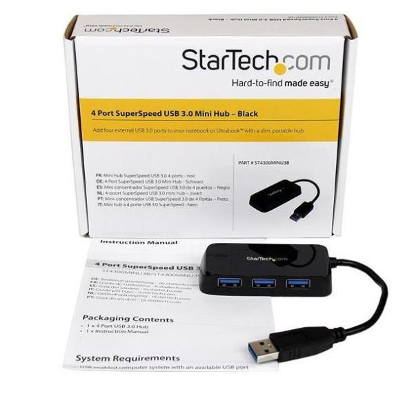 L’hub Mini USB 3.0 SuperSpeed portatile a 4 porte (nero) ST4300MINU3B permette di espandere la connettività USB trasformando una singola porta USB 3.0 in quattro porte USB 3.0 esterne. Il design del cavo integrato rende questo hub mini USB l’accessorio ideale per Mac®/notebook PC o computer Ultrabook™.