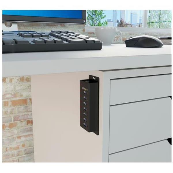 Questo hub è ideale per una configurazione permanente con un computer desktop grazie al resistente alloggiamento in metallo in grado di resistere all’usura e consumo provocati dall’utilizzo quotidiano. Può essere inoltre fissato a una superficie come, ad esempio, una scrivania o una parete, utilizzando la staffa per montaggio a parete inclusa.