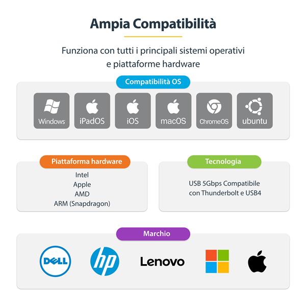 È sufficiente collegare questo adattatore da USB-C a Ethernet alla porta USB di un laptop per connettersi a una rete. Il chipset Realtek del convertitore di rete assicura il supporto nativo dei driver per Windows (10/11, ARM supportato), Macbook (MacOS), Chromebook (ChromeOS), Snapdragon, Linux, iPhone e tablet. Tutti i sistemi operativi Windows che non dispongono del driver verranno automaticamente invitati a scaricare il software direttamente dall’adattatore; garantendo un’installazione rapida ed efficace senza necessità di accesso a Internet