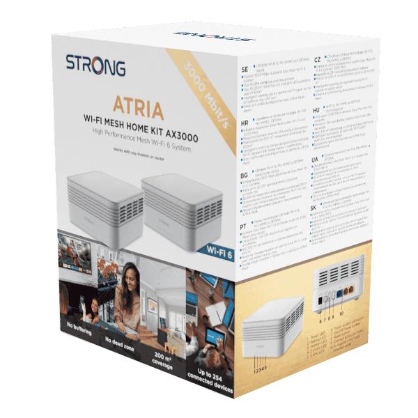 Utilizzando la soluzione Easy Mesh all’avanguardia, il Wi-Fi Mesh Home Kit AX3000 di STRONG combina la tecnologia Mesh con il potente standard Wi-Fi 6 MU-MIMO per la massima velocità e copertura a casa. Questo pacchetto, contenente 2 ATRIA Mesh AX3000, sostituisce la vostra rete Wi-Fi attuale senza cambiare il vostro router o modem e porta una rete Wi-Fi super-veloce ed un roaming senza interruzioni con una velocità fino a 3000 Mbit/s con una copertura fino a 350 m².