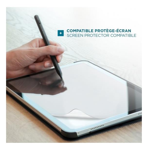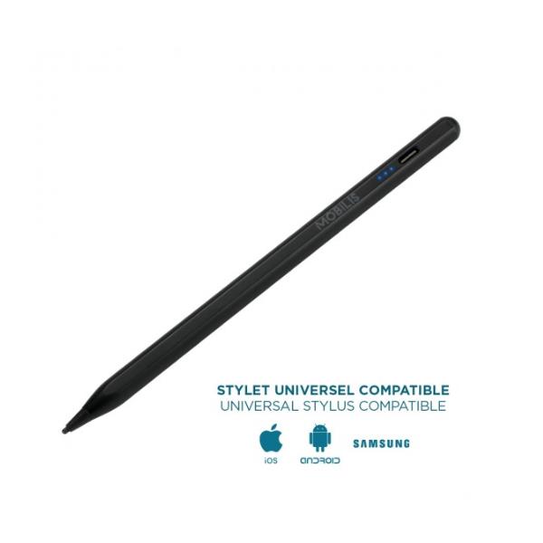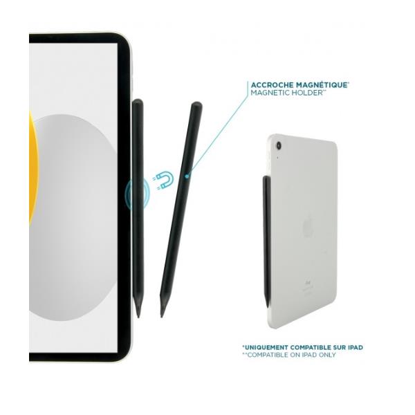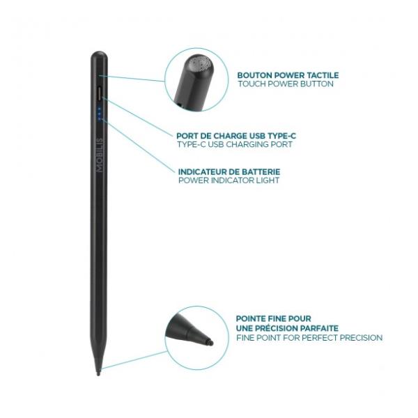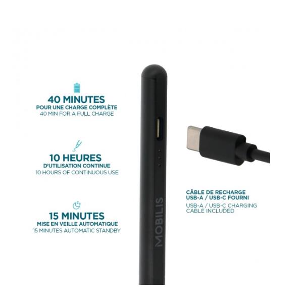 Con questa penna MOBILIS® puoi scrivere, disegnare e navigare con grande fluidità e sensibilità di scrittura. La sua punta (1,45 mm) consente movimenti precisi e continui. Questa penna funziona anche se il tablet è dotato di uno schermo protettivo. Grazie al suo design sottile e leggero, è comoda e facile da impugnare. Per accendere e spegnere la penna, basta toccare due volte l’estremità della penna. pronta all’uso, quindi non è necessario collegarla al tablet. Ha una durata della batteria di 10 ore (uso continuo) dopo una ricarica di soli 40 minuti (cavo USB A/USB C in dotazione). 3 spie luminose mostrano il livello della batteria. La penna entra automaticamente in modalità standby dopo 15 minuti di inattività. Per prolungare la durata della penna, è incluso un kit di ricambio (punta + cavo). Grazie a un sistema magnetico, può essere fissata al lato dell’iPad.
