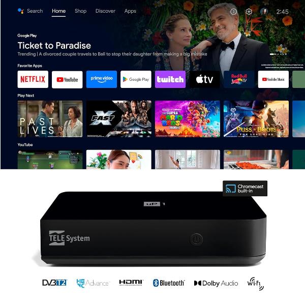 UP1 è l’innovativo decoder Android TV Ultra HD TELE System, erede ed evoluzione del famoso UP T2 4K, in grado di rendere “SMART” qualunque TV, oltre ad aggiornare la televisione ai nuovi standard di trasmissione grazie al tuner digitale terrestre DVB-T2 HEVC HDR10 e HLG.