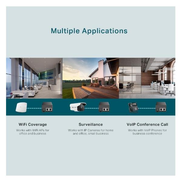 Il PoE Injector TL-POE160S soddisfa i requisiti dello standard IEEE 802.3af/at, e può funzionare con tutti i PDs (Powered Devices) compatibili PoE IEEE 802.3af/at, i ricevitori PoE, come il modello TP-Link TL-POE10R, o altri prodotti equivalenti, per espandere la rete in luoghi in cui non ci sono linee o prese elettriche e nei quali si desidera collocare dispositivi come Access Point, telecamere e telefoni IP, ecc.