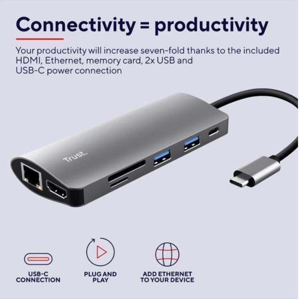 I laptop sottili sono stupendi, ma a volte la mancanza di porte di connessione può essere un problema. Beh, ora non più. Con l’adattatore 7 in 1 Trust Dalyx, la tua produttività aumenterà di sette volte grazie ai collegamenti in dotazione HDMI, Ethernet, scheda di memoria, USB e USB-C.