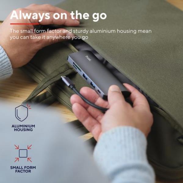 Se sei sempre in giro, l’adattatore 7 in 1 Trust Dalyx non ti rallenta neanche un po’. Il suo fattore di forma compatto, abbinato al solido alloggiamento in alluminio, ti permette di portartelo appresso ovunque. Non servono alimentatori aggiuntivi e, se fai delle foto nel weekend o in vacanza, il lettore di schede in dotazione ti permette di fare il backup delle foto senza difficoltà.