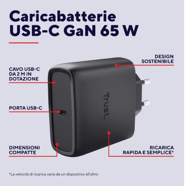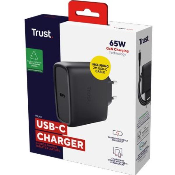 Alimentatore Notebook Trust Maxo 65W USB-C Gan Nero Cavo Incluso