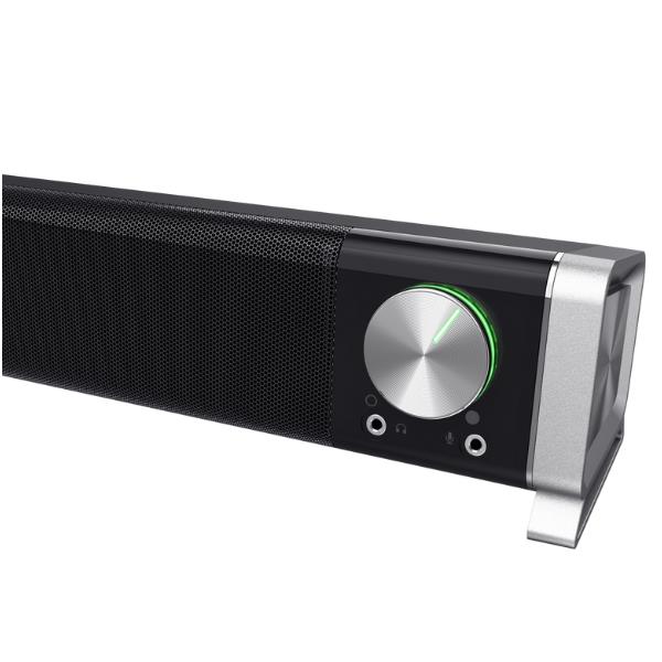 Non occorre alcun caricabatteria a parete: collegando semplicemente la soundbar a una porta USB, si ottiene l’audio plug & play. Inoltre, le porte anteriori per cuffia e microfono rappresentano un comodo accesso.