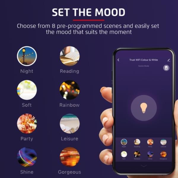 Passa all’illuminazione smart! Ti basta lo smartphone per azionare facilmente la lampadina smart WiFi B22 RGB LED di Trust Smart Home WiFi, ovunque tu sia. Con la possibilità di scelta tra oltre 16 milioni di colori, riuscirai sempre a creare l’atmosfera adatta.