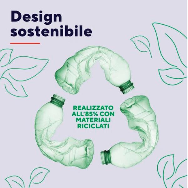 - Costruzione sostenibile con l’85% di plastica riciclata.