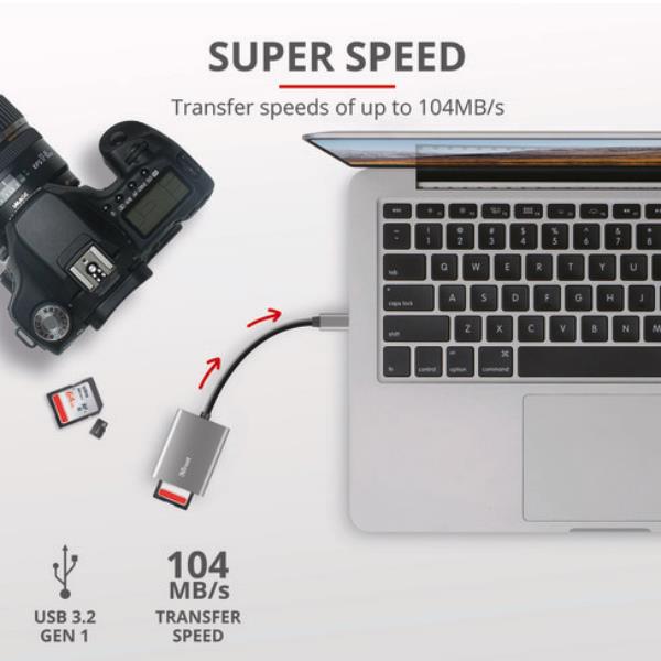 Il lettore di schede Trust DALYX è la soluzione perfetta per trasferire foto e video in modo rapido e affidabile. Grazie alla connessione USB-C Ultraveloce e al design compatto in alluminio, è lo strumento ideale per fotografi e videomaker che lavorano sul campo.