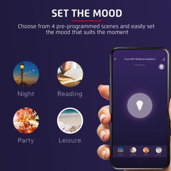 Prendi il controllo della luce in casa tua, senza complicazioni. Il faretto smart WiFi GU10 LED di Trust Smart Home si collega direttamente alla tua rete domestica: niente hub aggiuntivi, niente spese extra. Hai il WiFi? Hai già tutto ciò che serve.