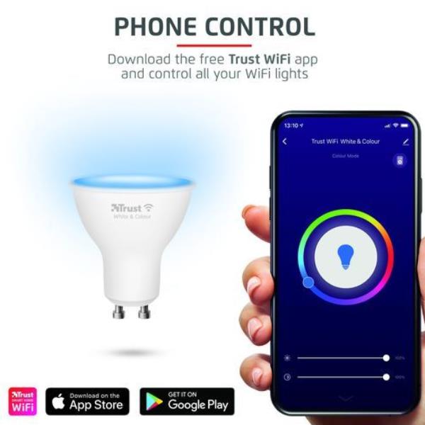 Prendi il controllo della luce in casa tua con il faretto smart WiFi GU10 RGB LED di Trust Smart Home. Basta una connessione internet per gestire l’illuminazione direttamente dal tuo smartphone, senza bisogno di hub aggiuntivi o complicati setup.