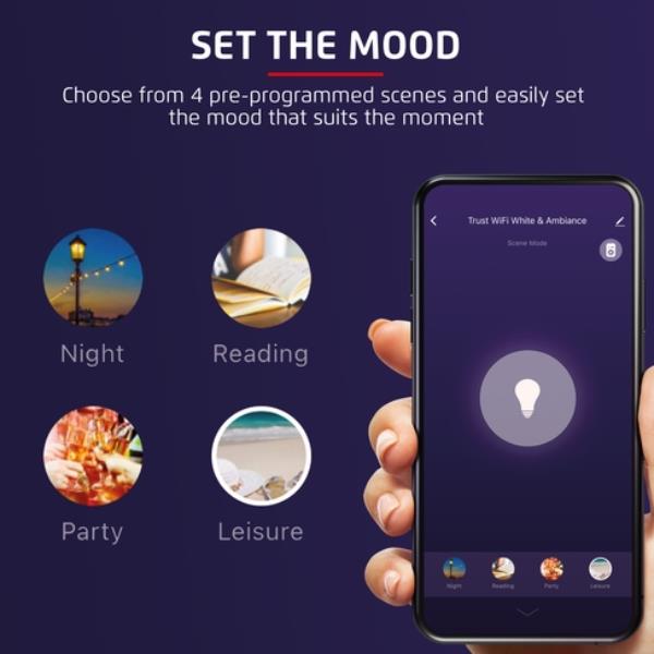 Con Trust WiFi, la comodità in casa tua raggiunge un nuovo livello. Puoi controllare le luci con lo smartphone e automatizzarle con l’app gratuita. Puoi impostare il timer per accendere o spegnere le luci a una data ora o persino regolare la luminosità.