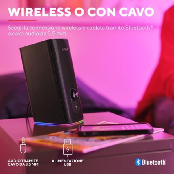 - Illuminazione RGB touch: L’atmosfera è nelle tue mani. Toccando il pannello superiore puoi cambiare colore e modalità di illuminazione, sincronizzando la luce al ritmo della tua musica.