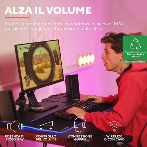 - Audio di potenza: Con una potenza di picco di 18W, riempie di suono dettagliato ogni angolo della tua casa, che tu stia guardando un film, giocando o ascoltando la tua playlist preferita.