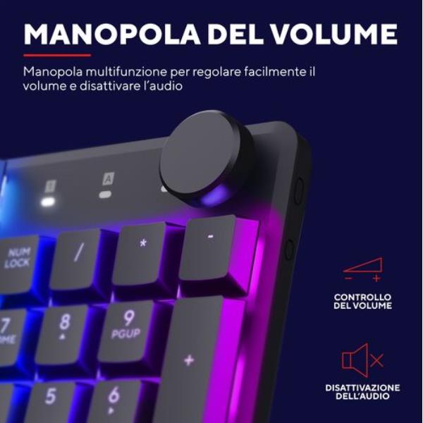 Ogni guerriero merita la miglior armatura! Ecco perché questa tastiera è dotata di una resistente piastra superiore in alluminio che le conferisce una sensazione di solidità e le permette di affrontare anche le sessioni di gaming più intense. Inoltre, è dotata di una pratica manopola del volume che consente di regolare il suono in tutta comodità.