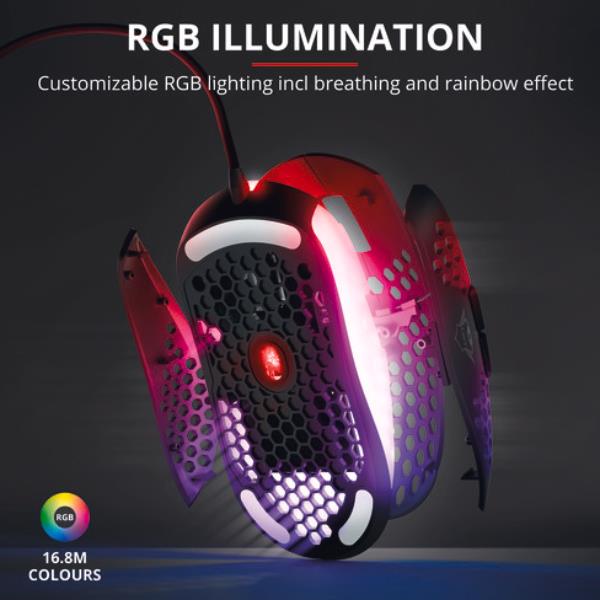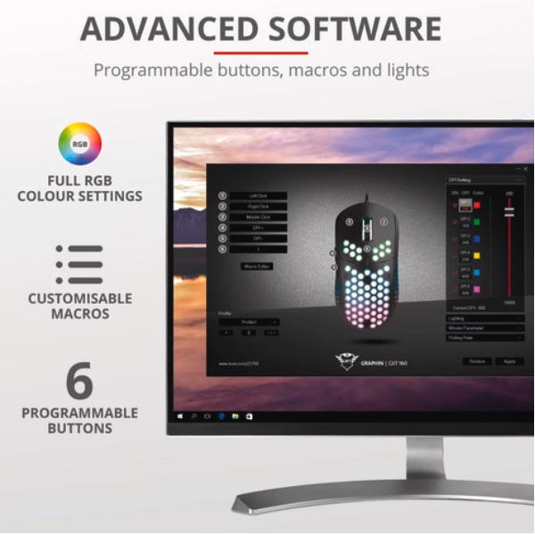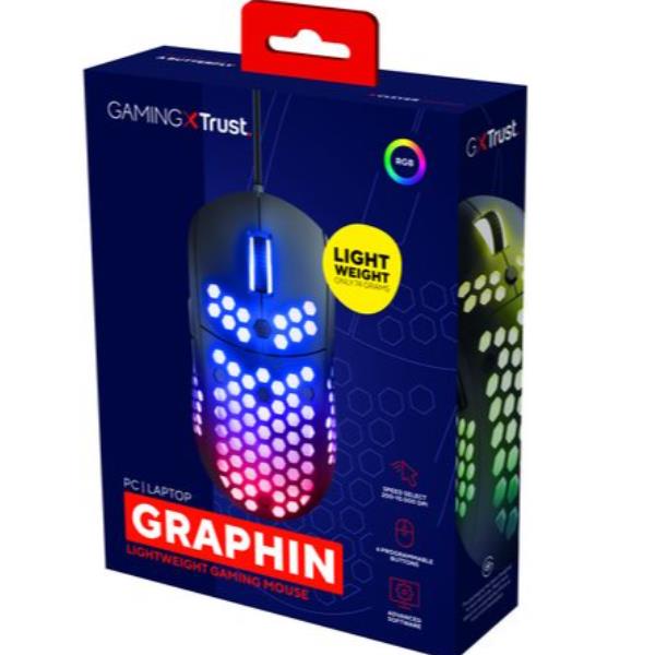 Il Trust GXT 960 Graphin pesa solo 74 grammi e, grazie alla struttura esterna del guscio a nido d’ape, consente una risposta più rapida e ore di gaming in pieno comfort.