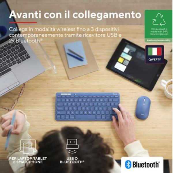 Ti piace il multitasking? Anche a Lyra! Con la sua capacità di collegare fino a tre dispositivi tramite ricevitore USB e 2x Bluetooth, puoi spostarti facilmente fra telefono, tablet e computer con tre pulsanti dedicati.