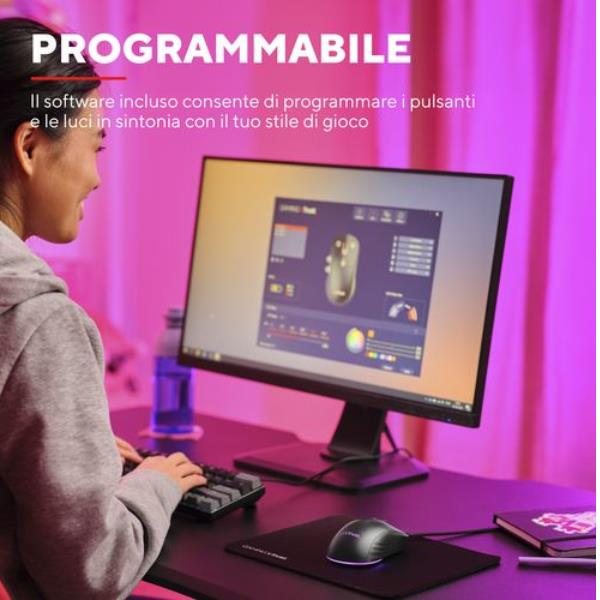Grazie all’RGB completo a 3 zone di Redex II potrai sentirti una vera stella. I lati, la rotellina per lo scrolling e il logo si illumineranno con 16,8 milioni di colori diversi (non sapevamo neanche ce ne fossero così tanti!) per un gaming ultra-cool.