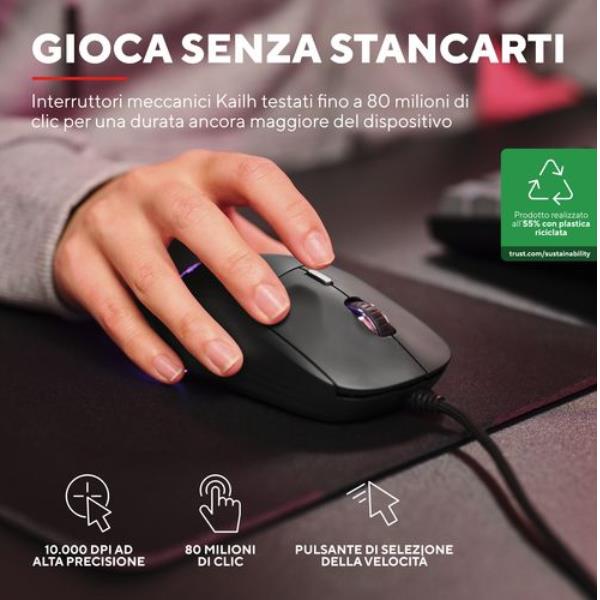 Una vittoria per te, una vittoria per il pianeta. Con un design sostenibile realizzato con il 55% di plastica riciclata, questo mouse consente di fare una scelta più responsabile per quanto riguarda gli accessori da gaming.