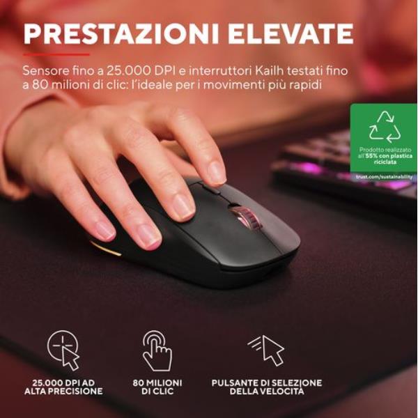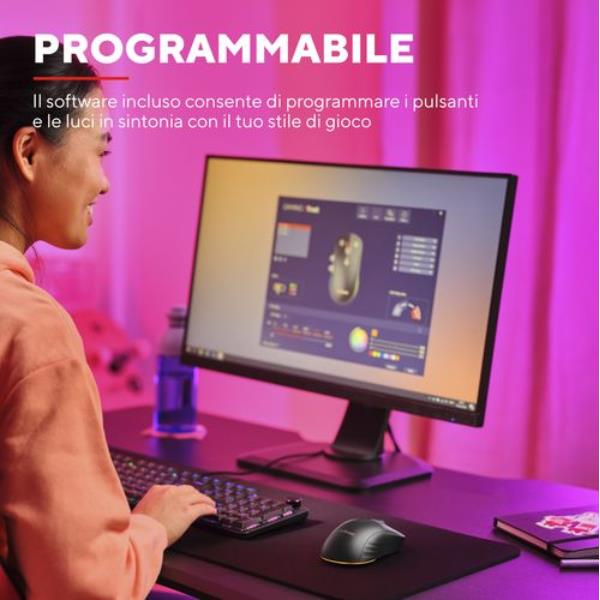 - Sensore ad alte prestazioni: 25.600 DPI, 400 IPS, 50G.