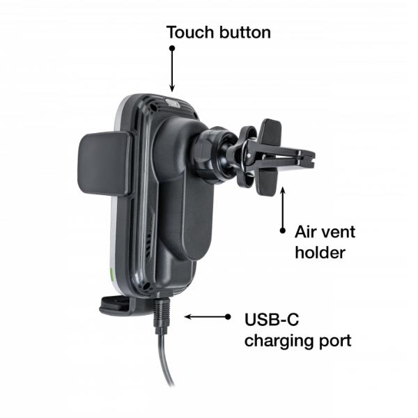 Supporto per caricabatterie da auto a bloccaggio automaticoQuesto porta telefono a ricarica rapida è facile da usare, sicuro e conveniente. Puoi scegliere se installare il porta telefono nella bocchetta dell’aria dell’auto o se fissarlo al cruscotto o al finestrino tramite la ventosa. Quando il telefono viene inserito nel supporto, i bracci di bloccaggio laterali si chiudono automaticamente, il che mantiene il telefono in posizione. I bracci si aprono con un leggero tocco sul sensore posto sulla parte superiore del caricabatterie. Il supporto può ruotare di 360° per consentire una visione ottimale e un più facile utilizzo delle funzioni.