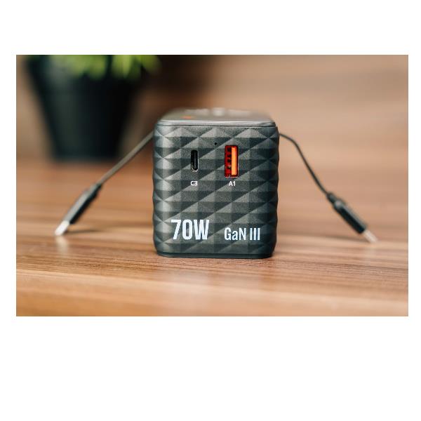 Dite addio a fili disordinati e cavi dimenticati. L’adattatore Charge ‘n’ Travel 70W GaN III è dotato di due cavi USB-C retrattili integrati, integrati direttamente nel dispositivo. Questa caratteristica innovativa permette di mantenere tutto compatto e senza grovigli, pur offrendo una ricarica potente in movimento. Che tu stia passando da una camera d’albergo all’altra o lavorando in un bar, i tuoi cavi essenziali sono sempre a portata di mano – non dovrai più rovistare nelle borse. Grazie al supporto per le spine universali, questo adattatore è il tuo nuovo strumento di viaggio indispensabile.